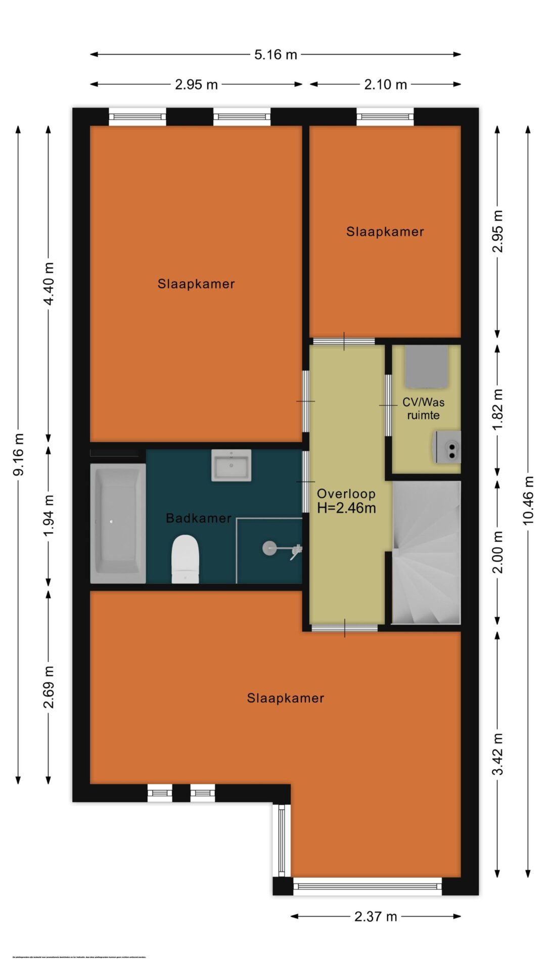 Overloop, 3 slaapkamers, badkamer met douche, ligbad, wastafel en toilet, separate was- en stookruimte.