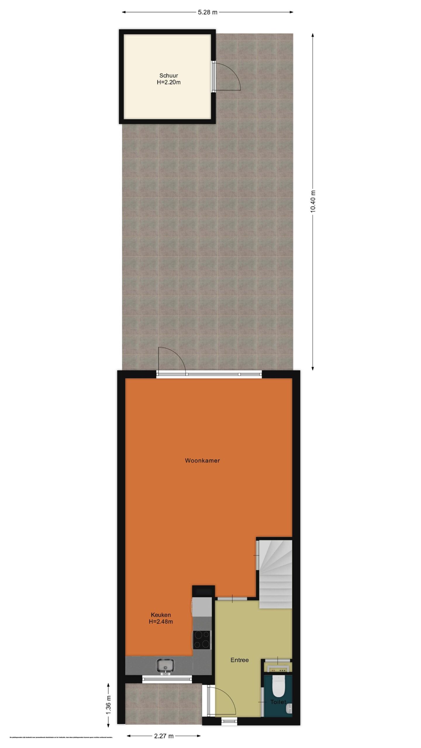 Entree, hal met meterkast, trapopgang, toilet met fontein, trapkast, woon-/eetkamer, open keuken voorzien van net keukenblok met inbouwapparatuur, deur naar de tuin. De achtertuin is gesitueerd op het oosten en voorzien van een houten berging en achterom