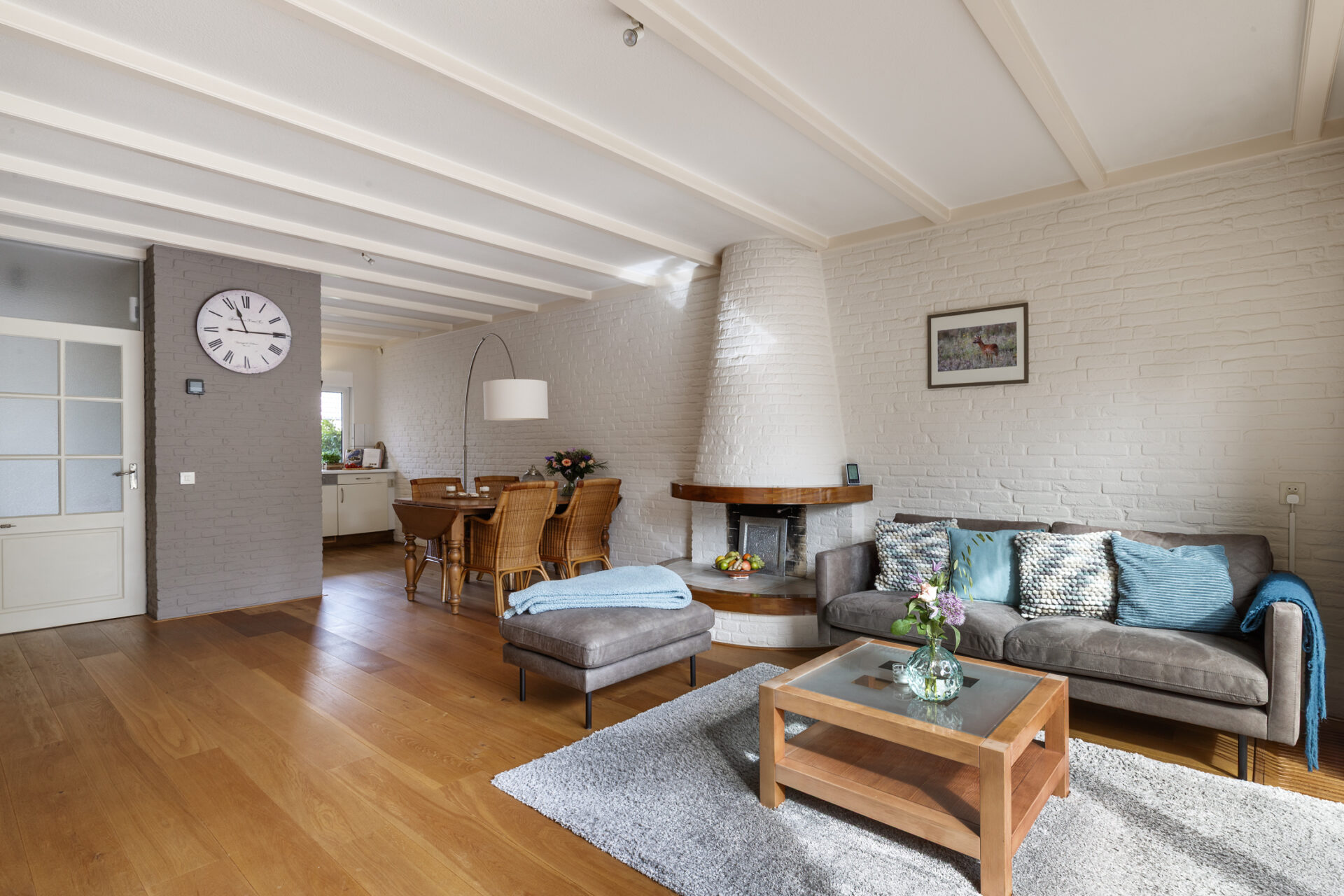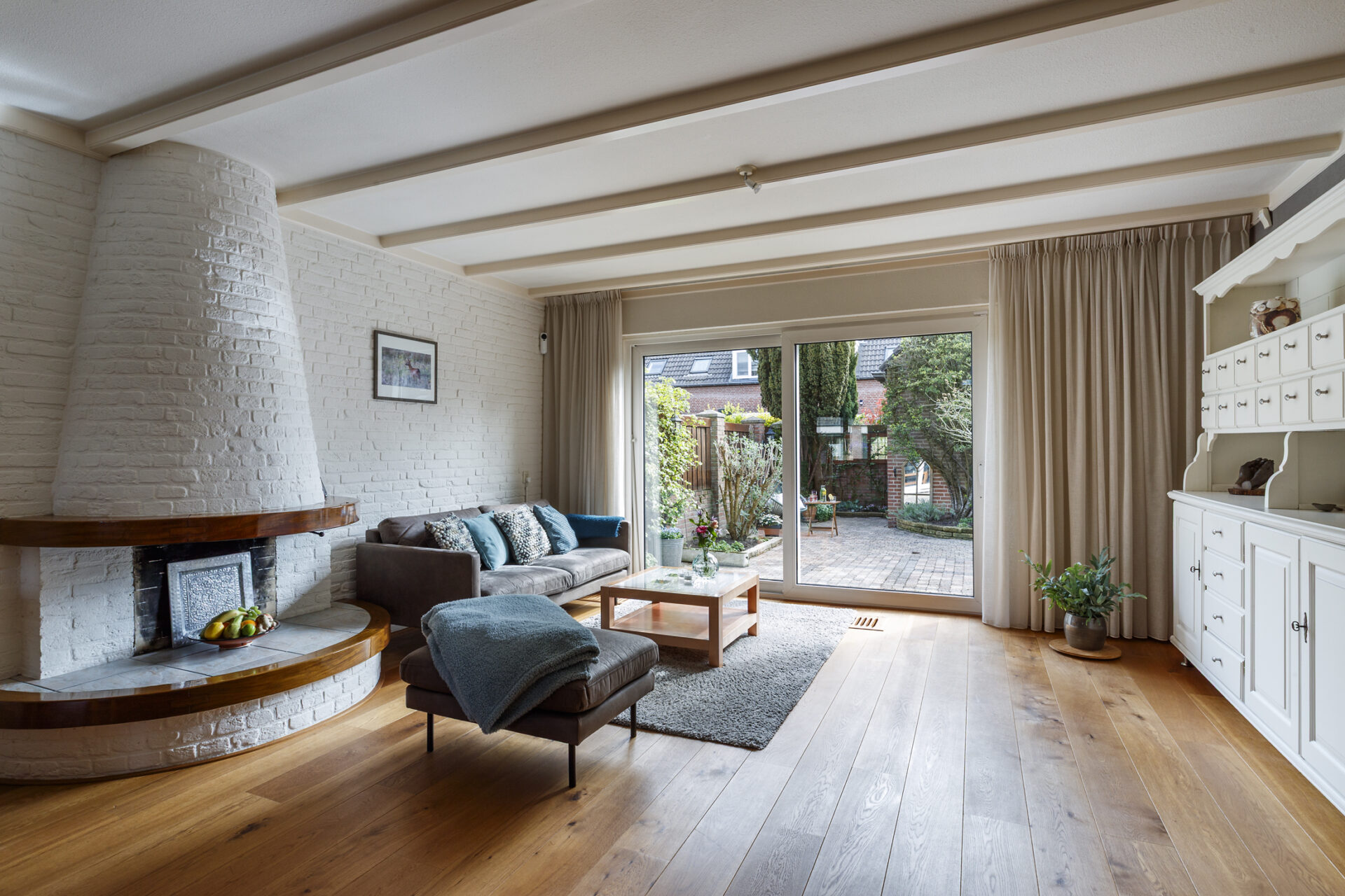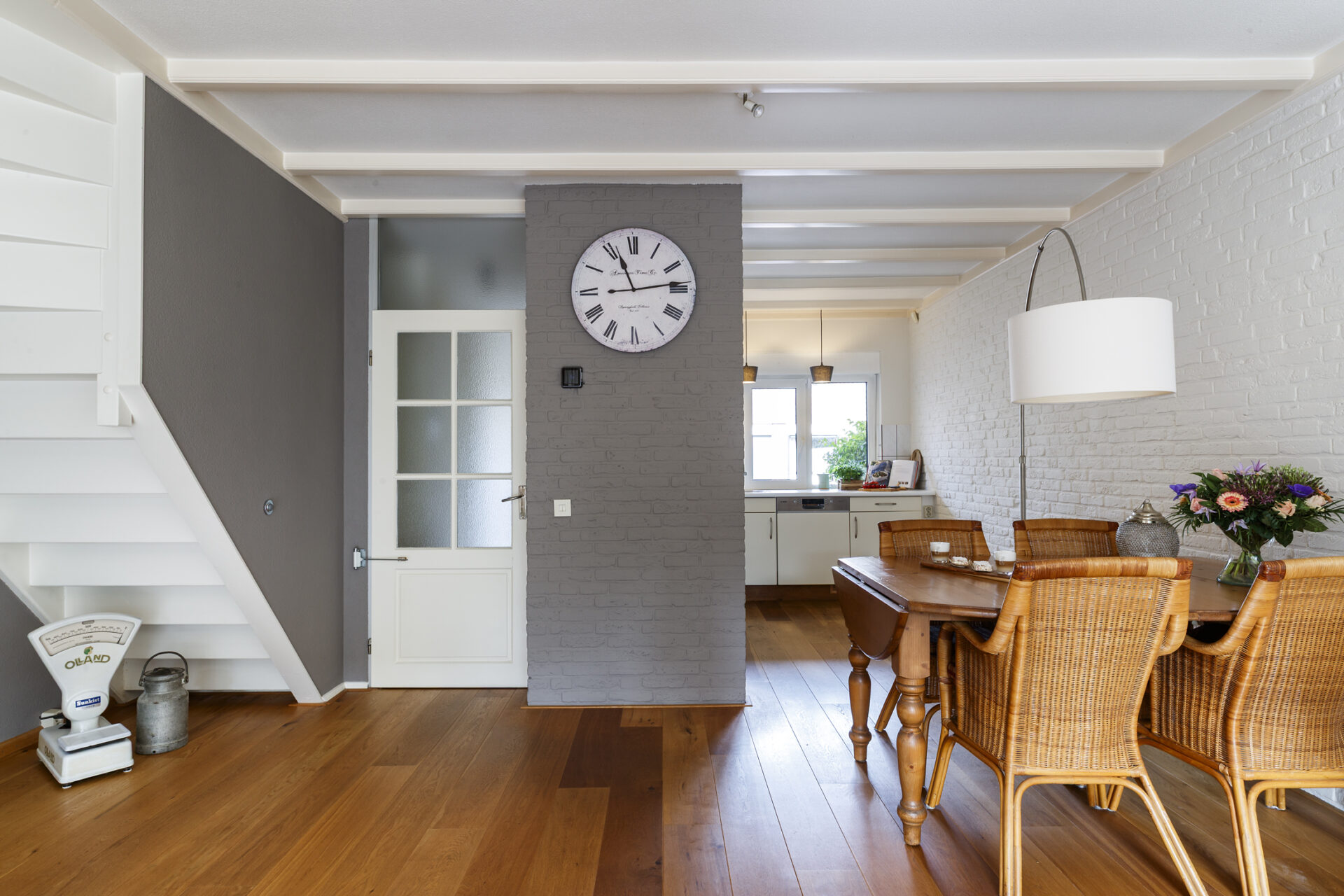 Je komt binnen in de hal met toilet, meterkast en trapopgang. Vanuit hier betreed je de lichte en sfeervolle woonkamer. Dankzij de grote raampartijen is dit een heerlijke leefruimte met een open en warme uitstraling. De woning is op de begane grond voorzien van kunststof kozijnen en rolluiken, wat zorgt voor extra comfort en gebruiksgemak.