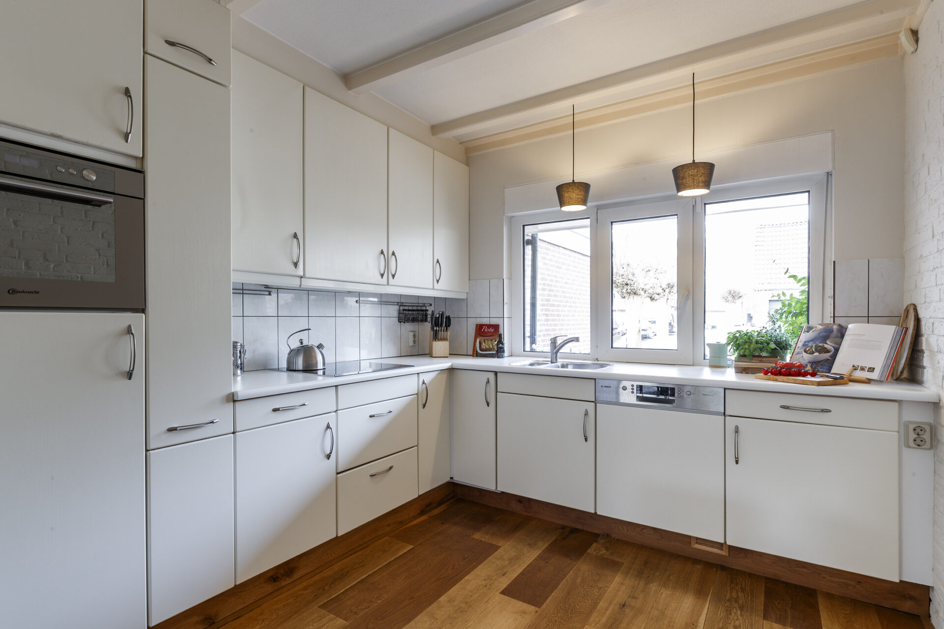 • Keuken aan de voorzijde in L-opstelling met inbouwapparatuur
