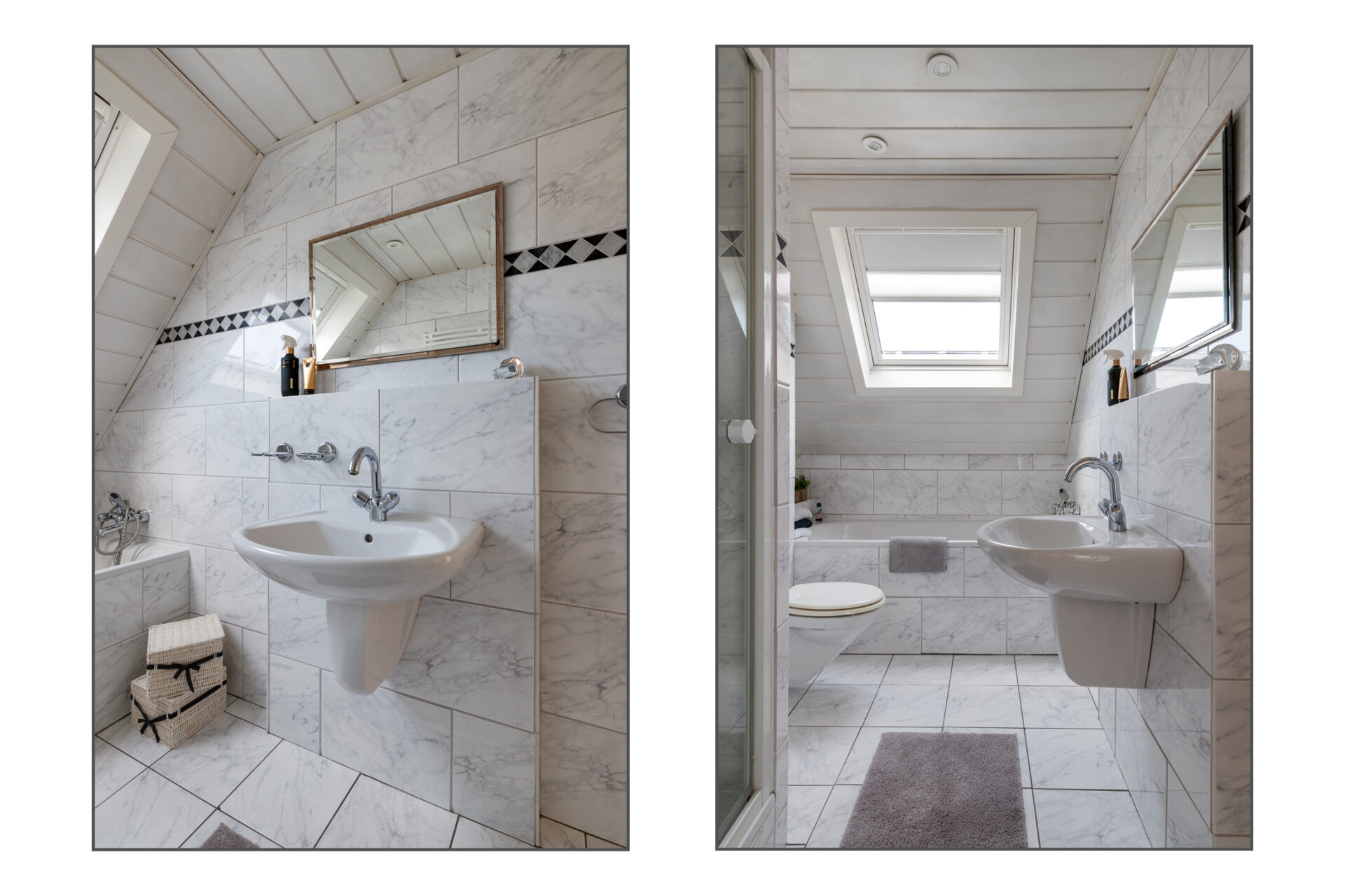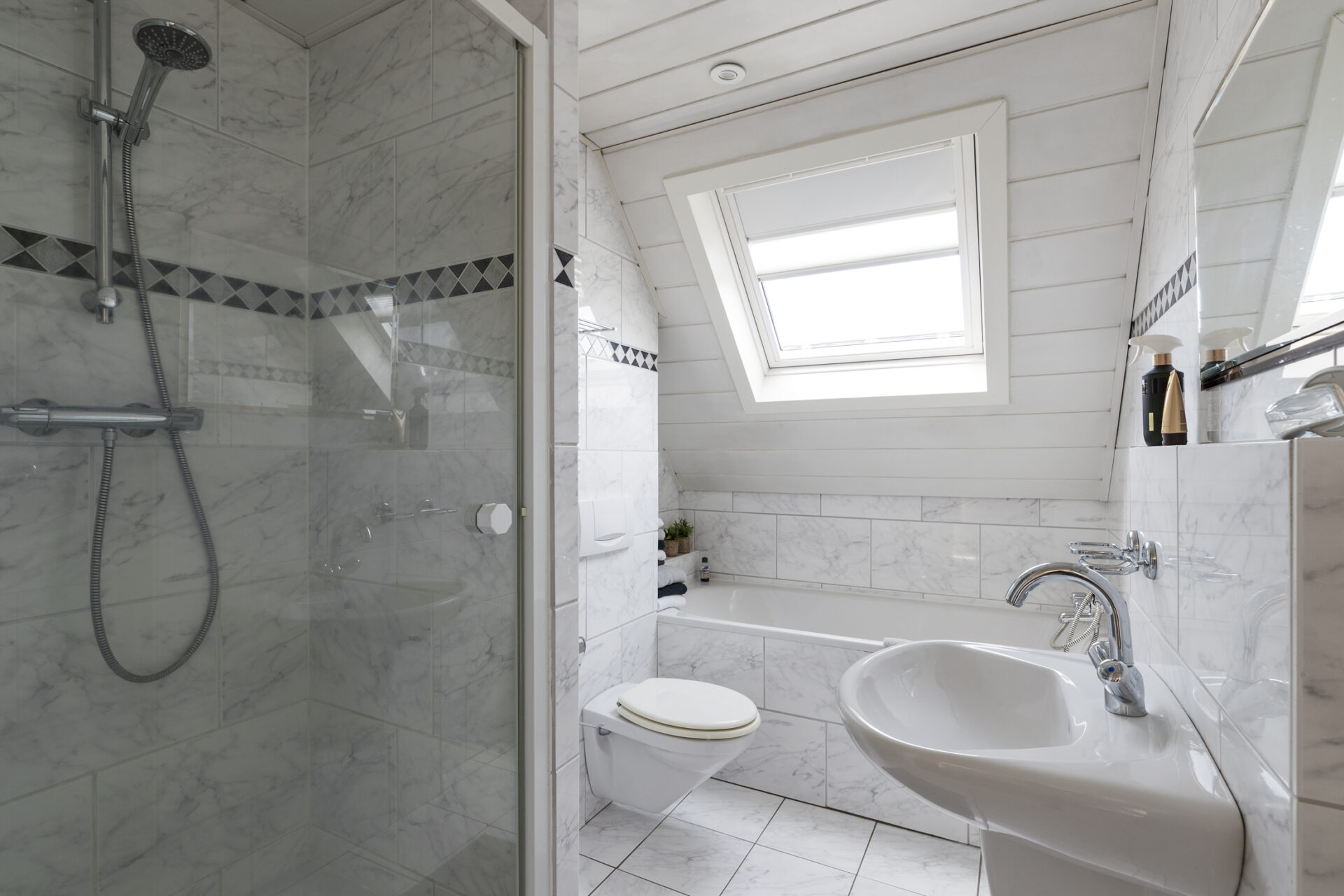 De badkamer is compleet uitgevoerd en voorzien van een ligbad, douche, wastafel en toilet. Daarnaast beschikt de badkamer over een Velux dakraam met binnen- en buitenzonwering, wat zorgt voor een prettige lichtregulering.