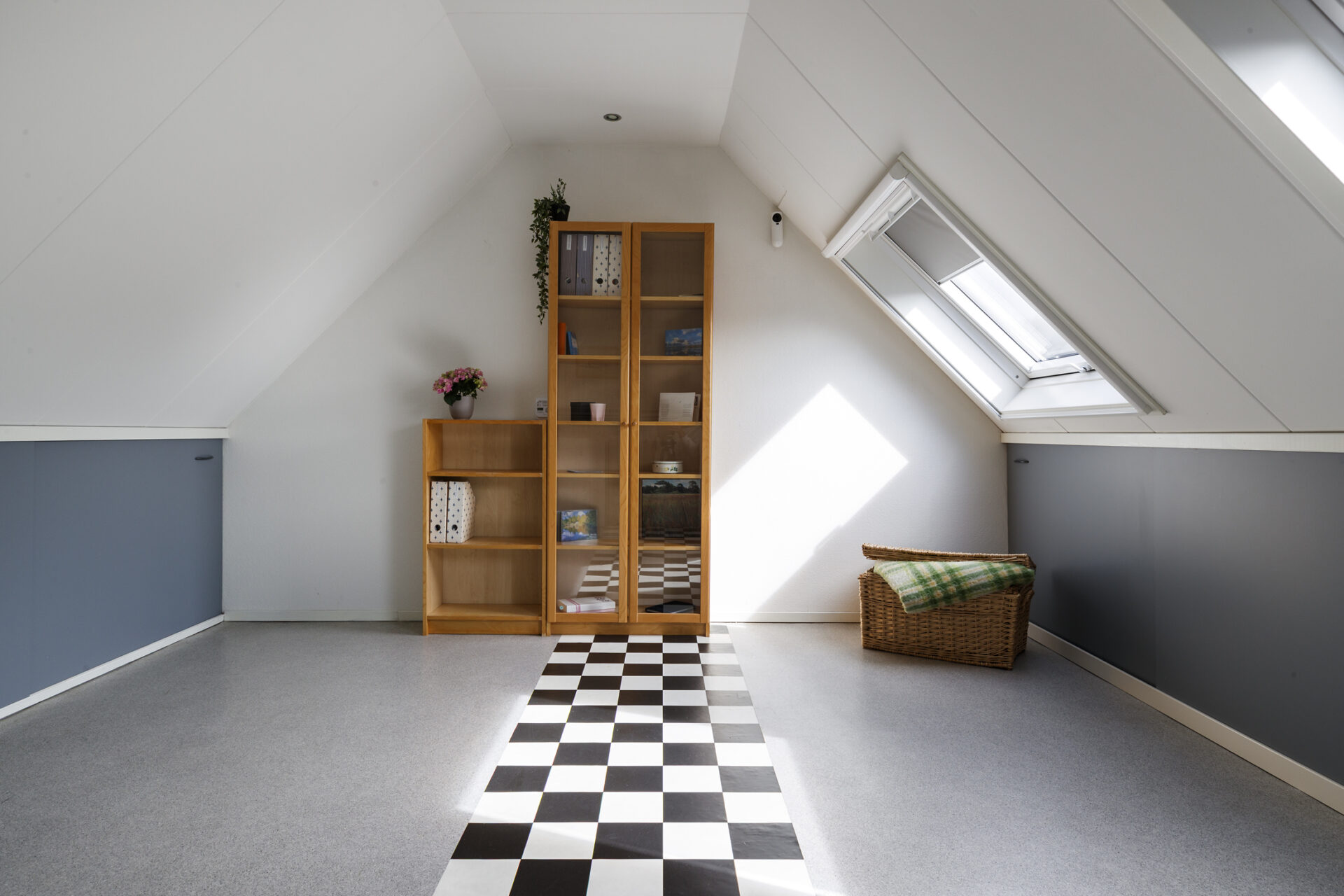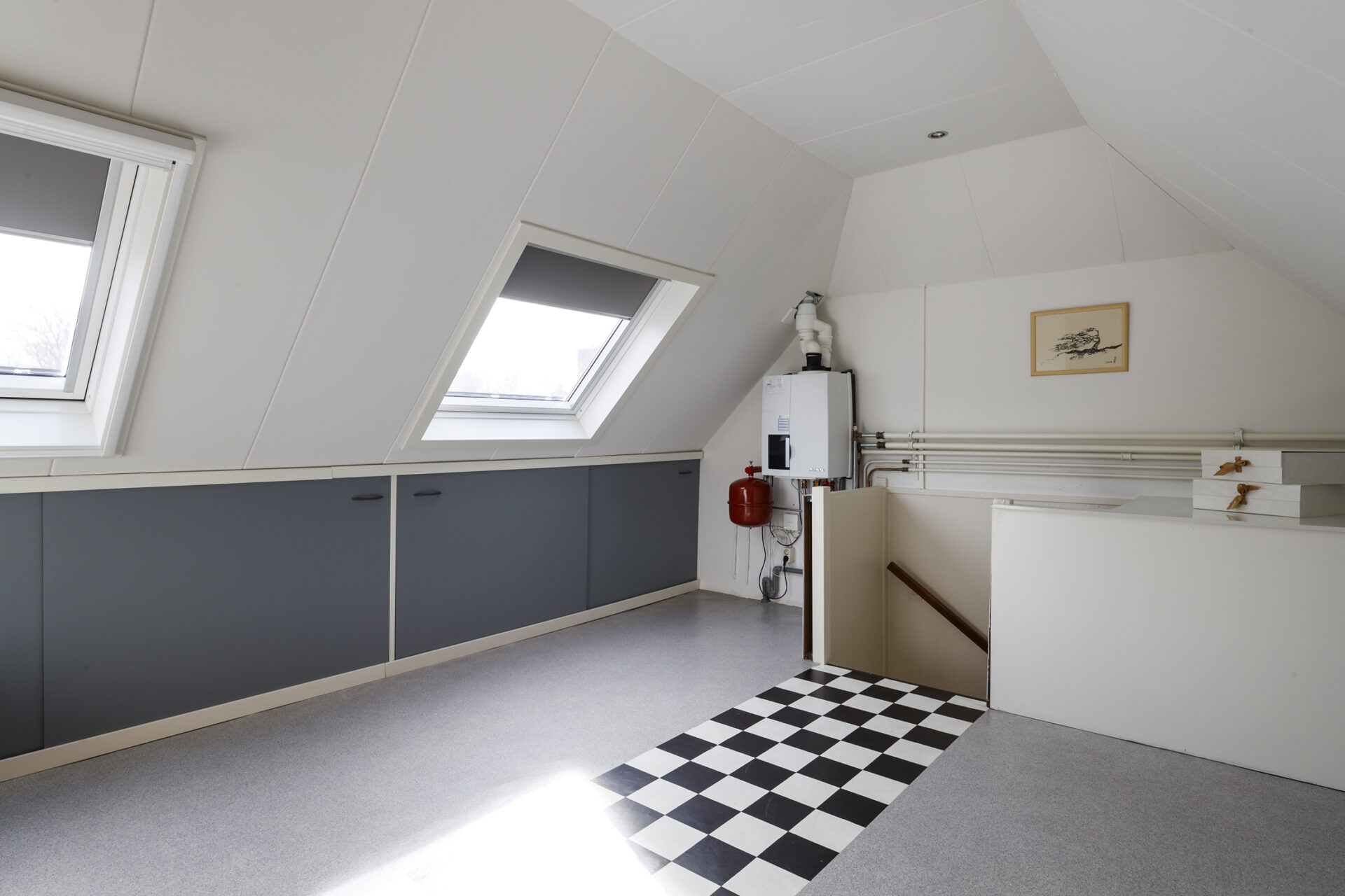 Ruime open zolderverdieping met een goede stahoogte en daglicht via twee grote Velux dakramen. Deze zijn voorzien van binnen- en buitenzonwering.
