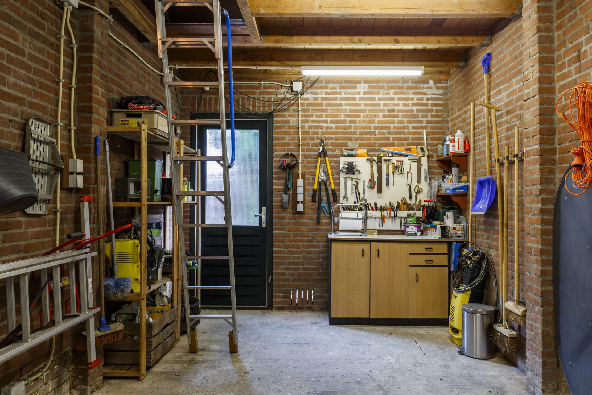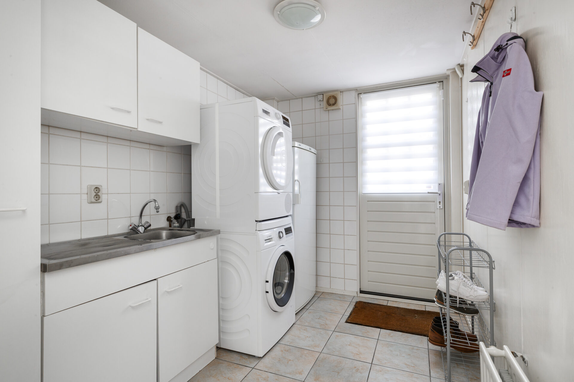 Vanuit de hal bereik je de bijkeuken. Deze ruimte is bijzonder praktisch ingericht met aansluitingen voor wasmachine en droger, extra bergruimte én een compacte keukenopstelling met warm en koud water – ideaal voor extra gemak of multifunctioneel gebruik.
