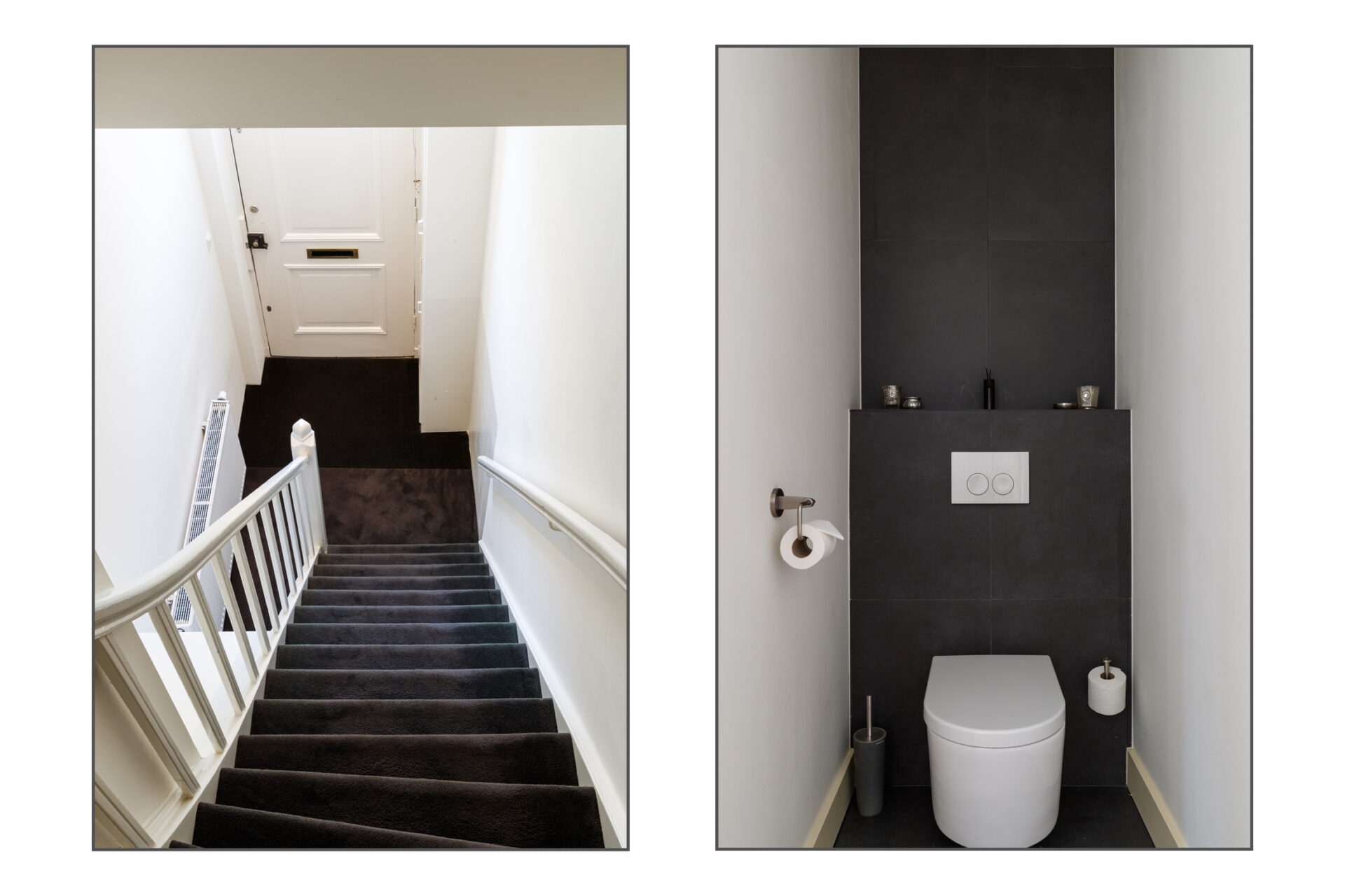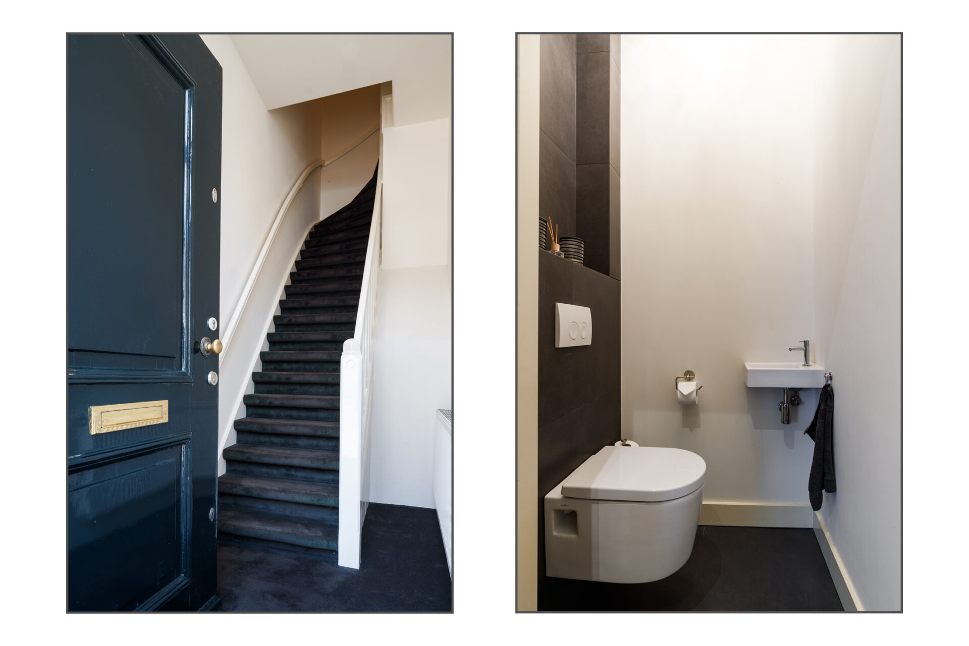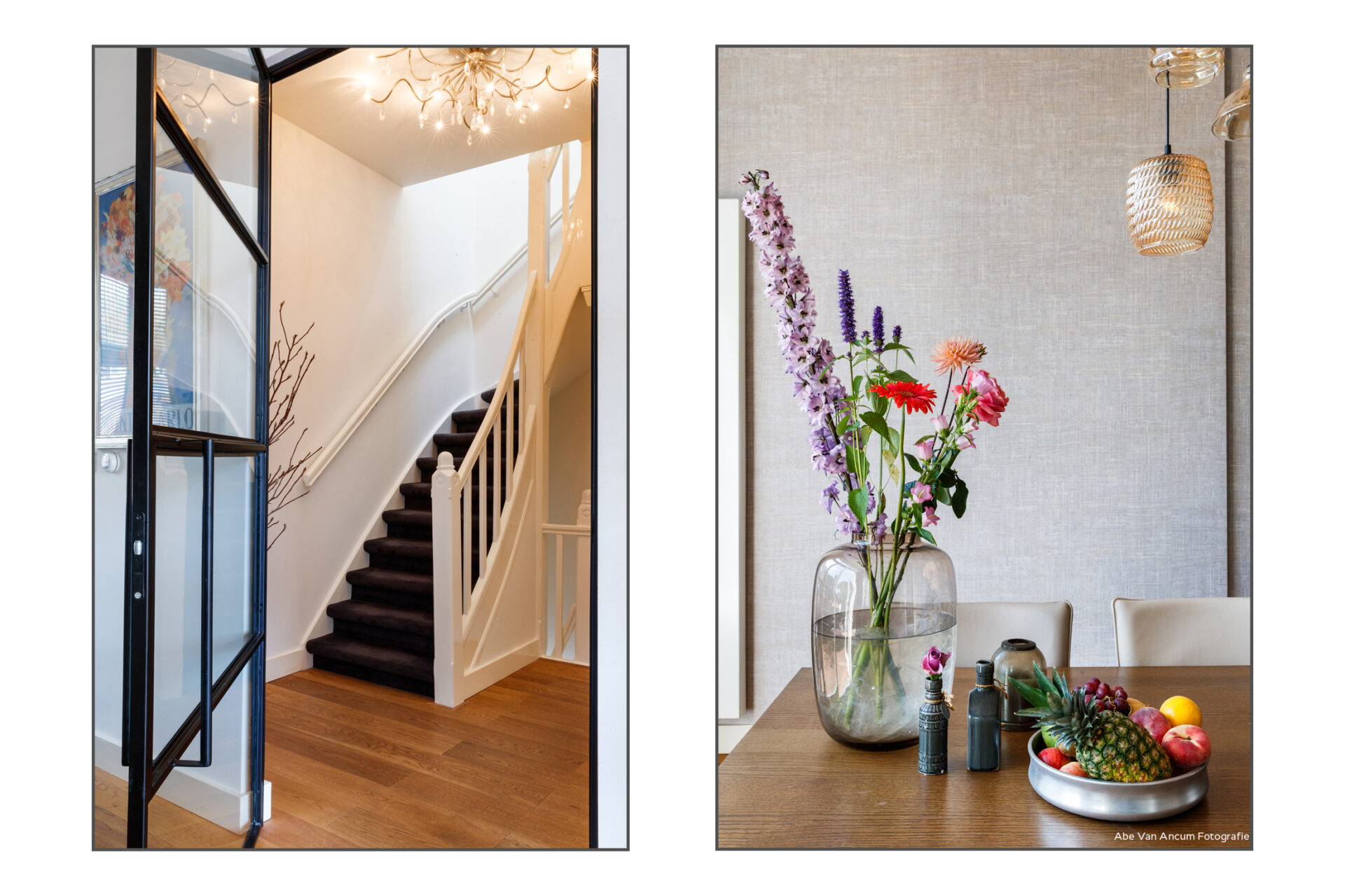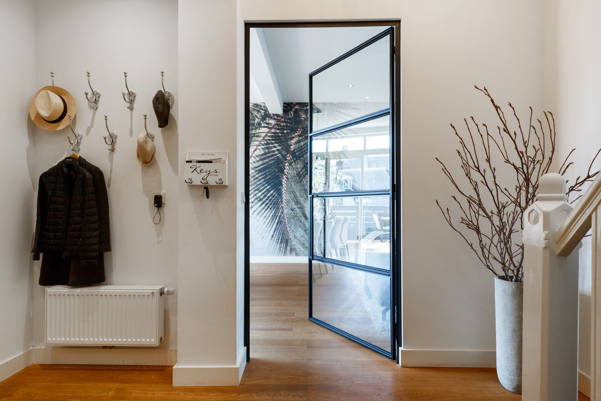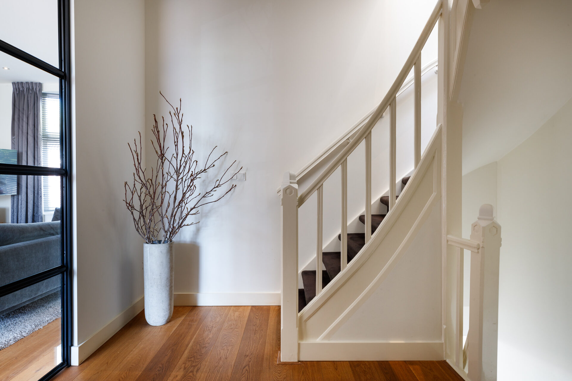 Begane grond: stijlvolle entree met meterkast en het royale trappenhuis naar de eerste verdieping. De trap is zwart gestoffeerd afgewerkt.