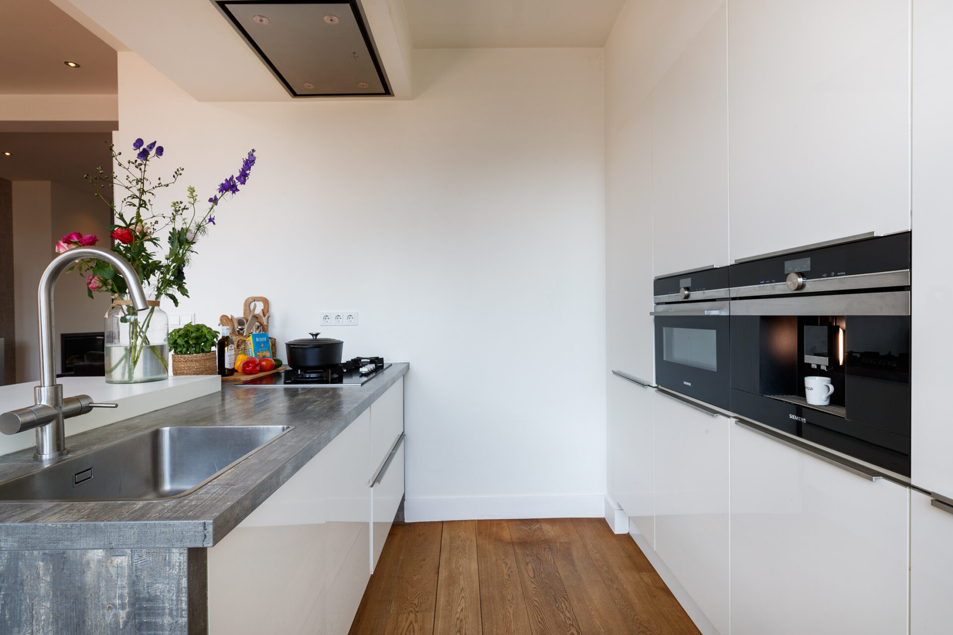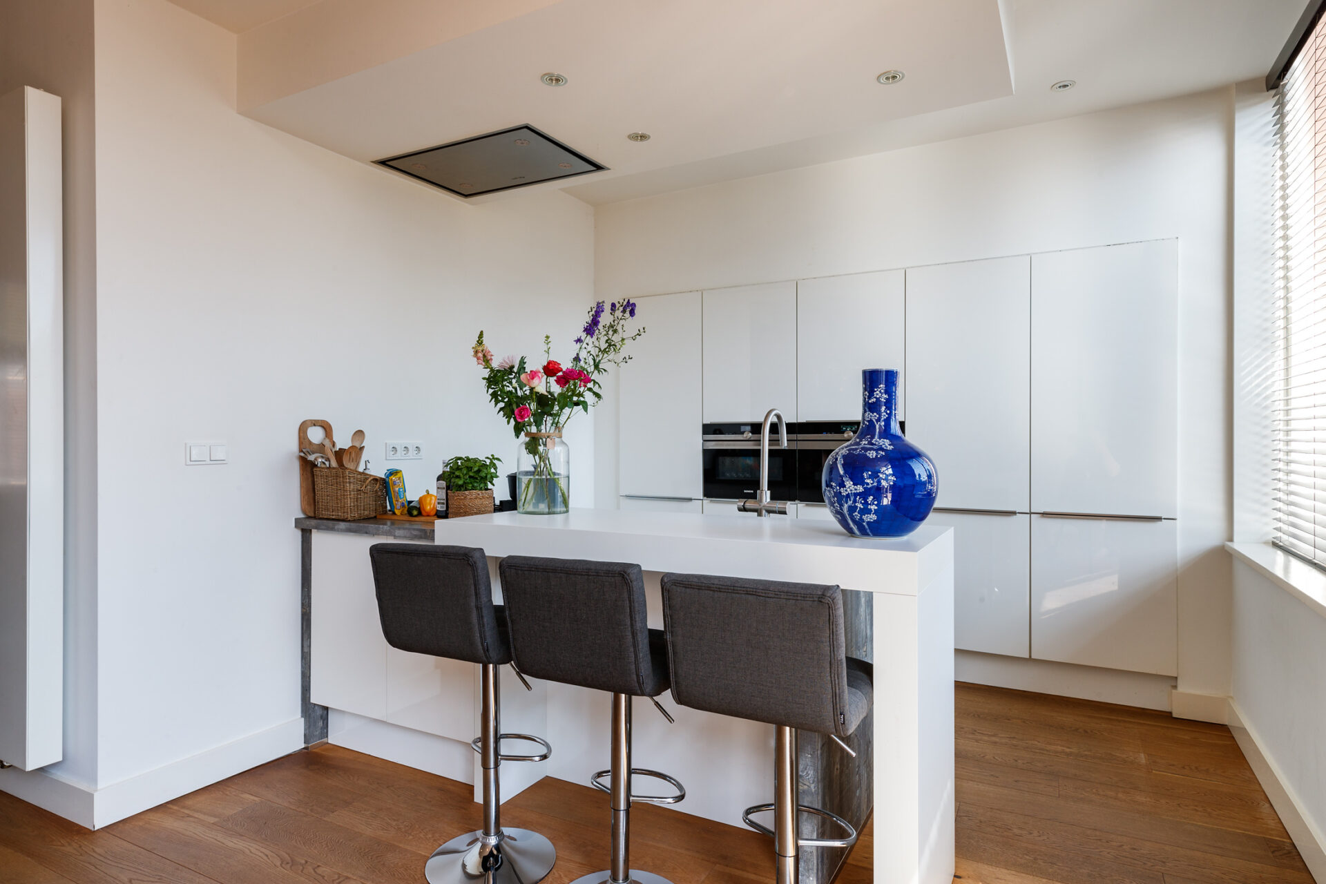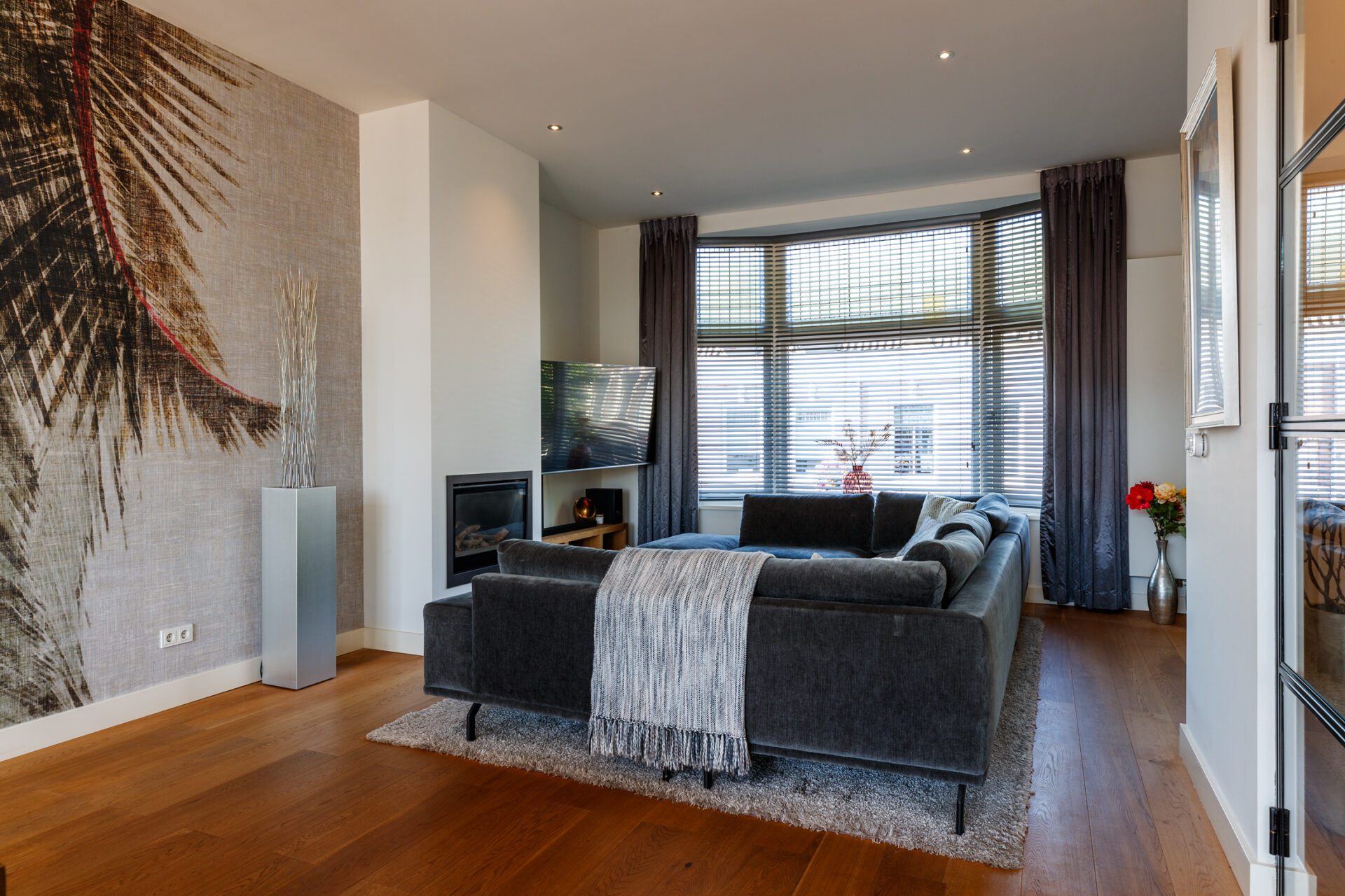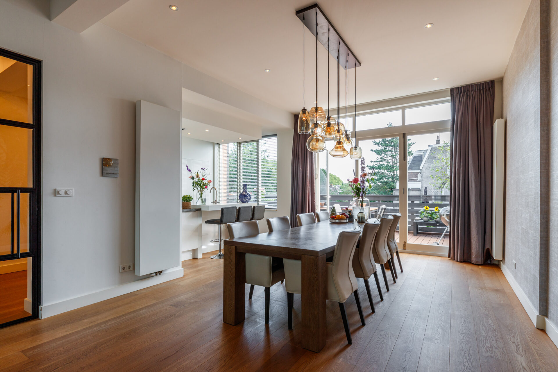 Eerste verdieping: zeer ruime en lichte hal, garderobe, toilet met fontein en toegang tot de gezellige ruime woonkamer (plafondhoogte 3.20m) met gashaard met sfeervolle erker met glas-in-lood ramen aan de voorzijde. Aan de achterzijde is de lichte open keuken met inbouwapparatuur zoals een vaatwasmachine, een gaskookplaat, een combi-oven magnetron en een ingebouwde koffiemachine. De openslaande deuren bieden toegang tot het dakterras waar je op alle momenten van de dag heerlijk kunt genieten.