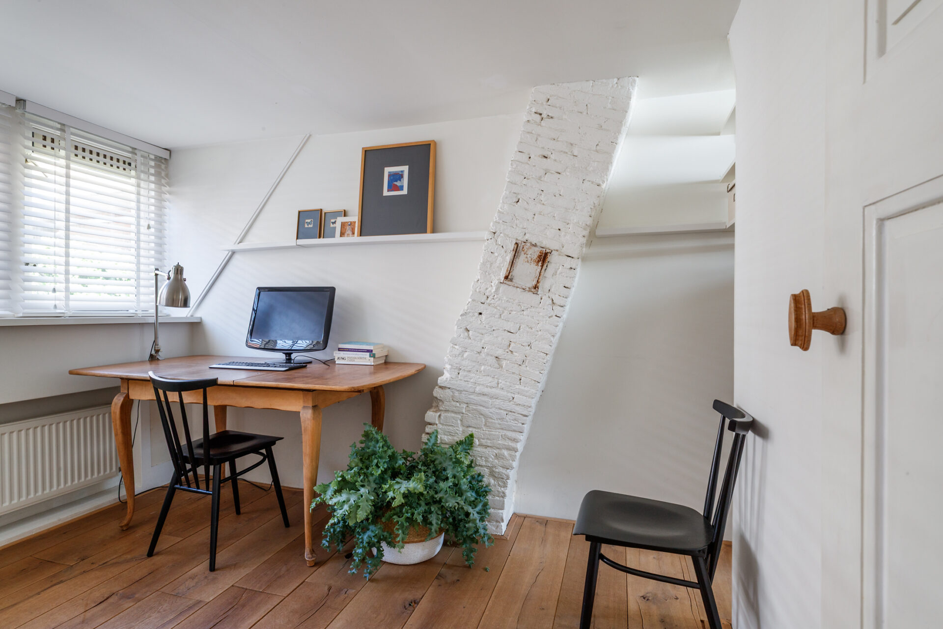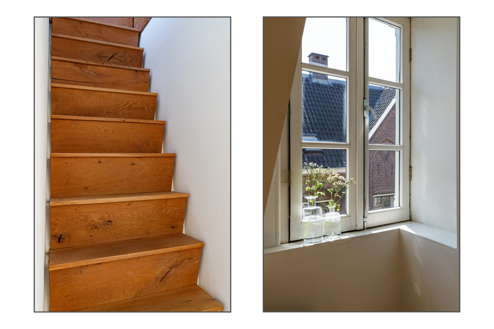 De eikenhouten vloer op de eerste verdieping is ook doorgelegd op de trap naar zolder.