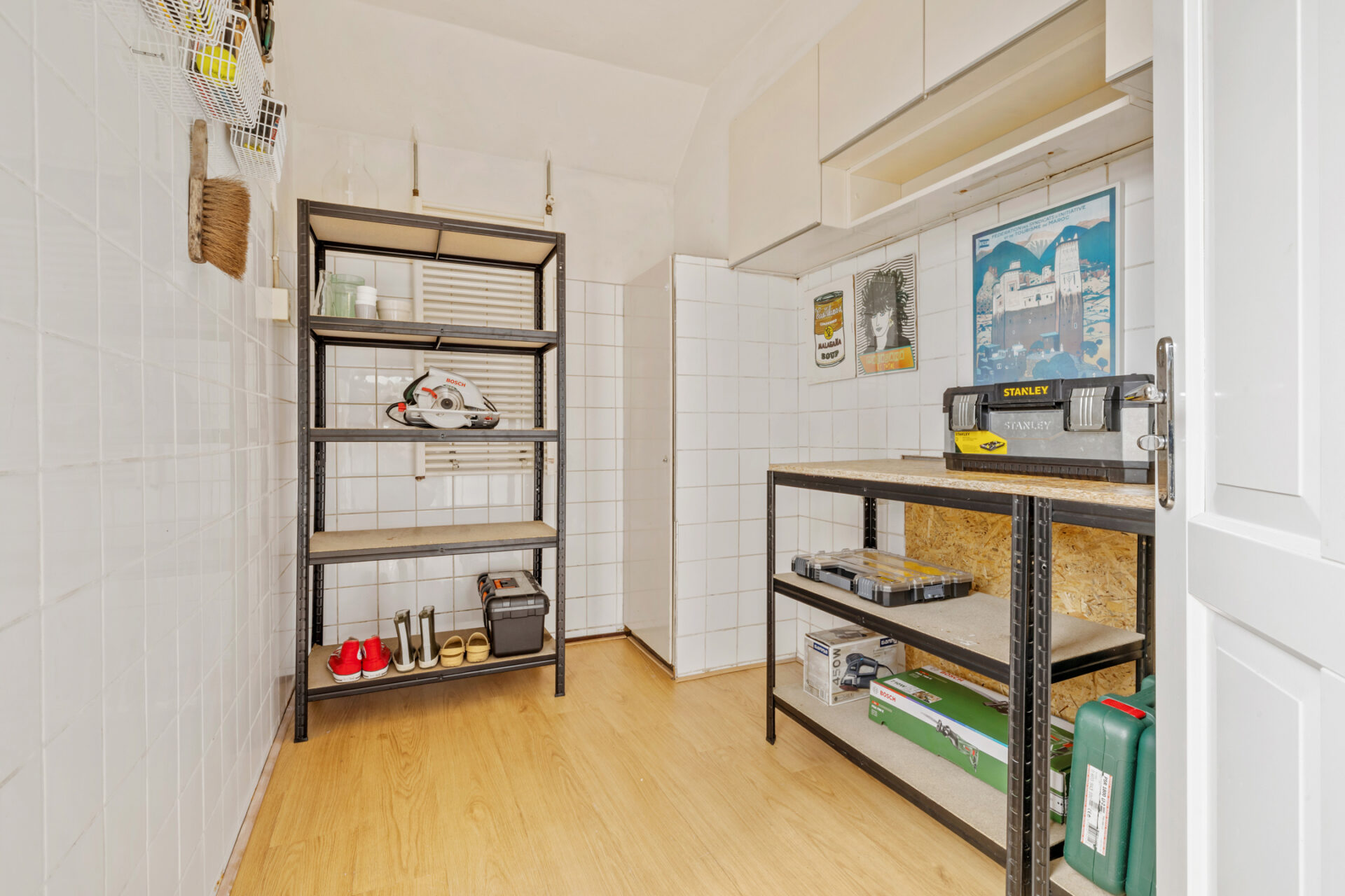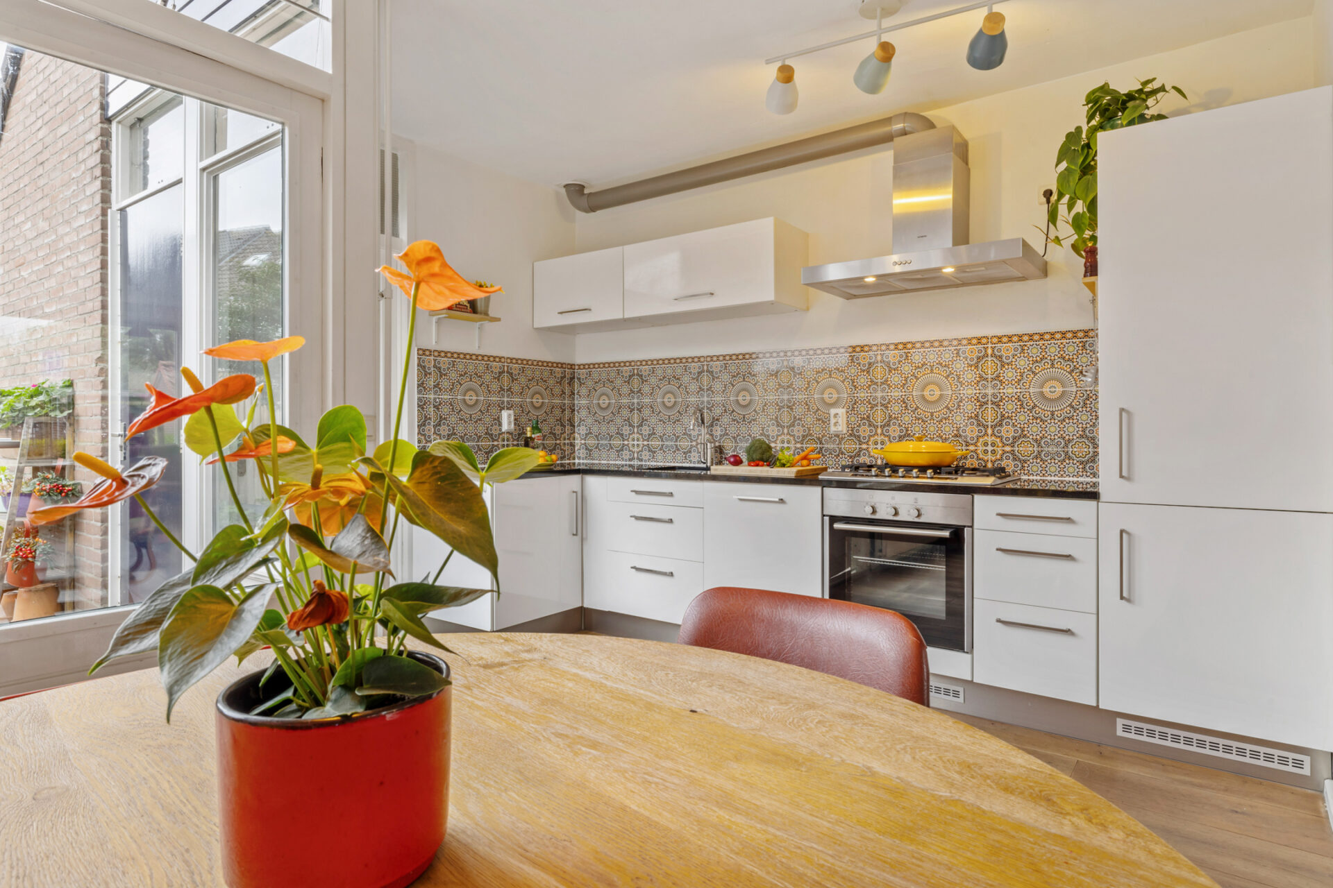 Entree, hal, meterkast, modern toilet met fontein, toegang tot de warme, sfeervolle woonkamer met trapkast en houten vloerdelen. Open keuken met L-vormig keukenblok en diverse inbouwapparatuur (gaskookplaat, afzuigkap, vaatwasser, koel-/vriescombinatie en oven). De indeling van de keuken is zeer aangenaam en praktisch in gebruik. Aansluitend aan de keuken bevindt zich de aangebouwde stenen berging. Deze is v.v. elektra en geeft net als de keuken toegang tot de tuin.