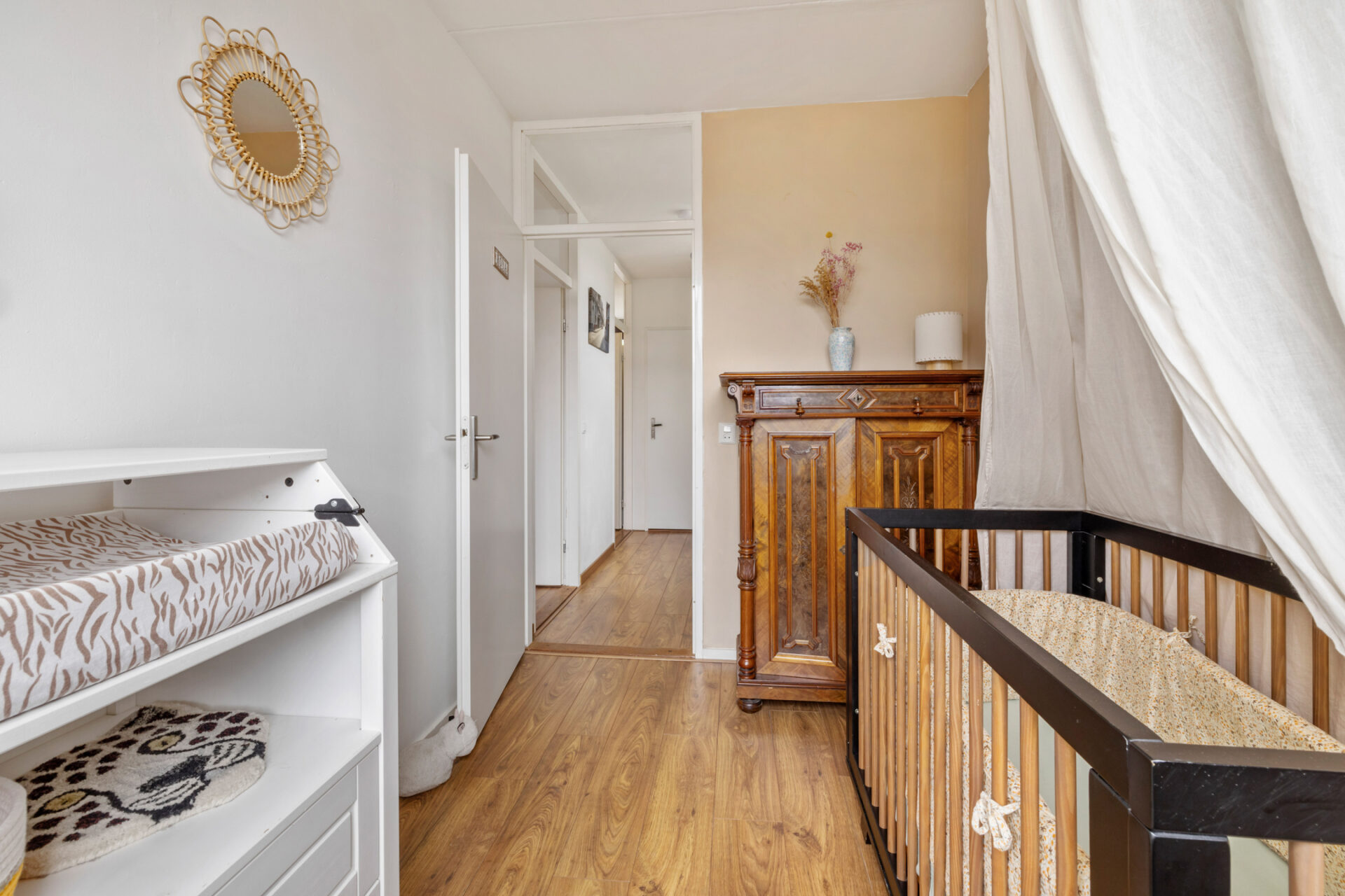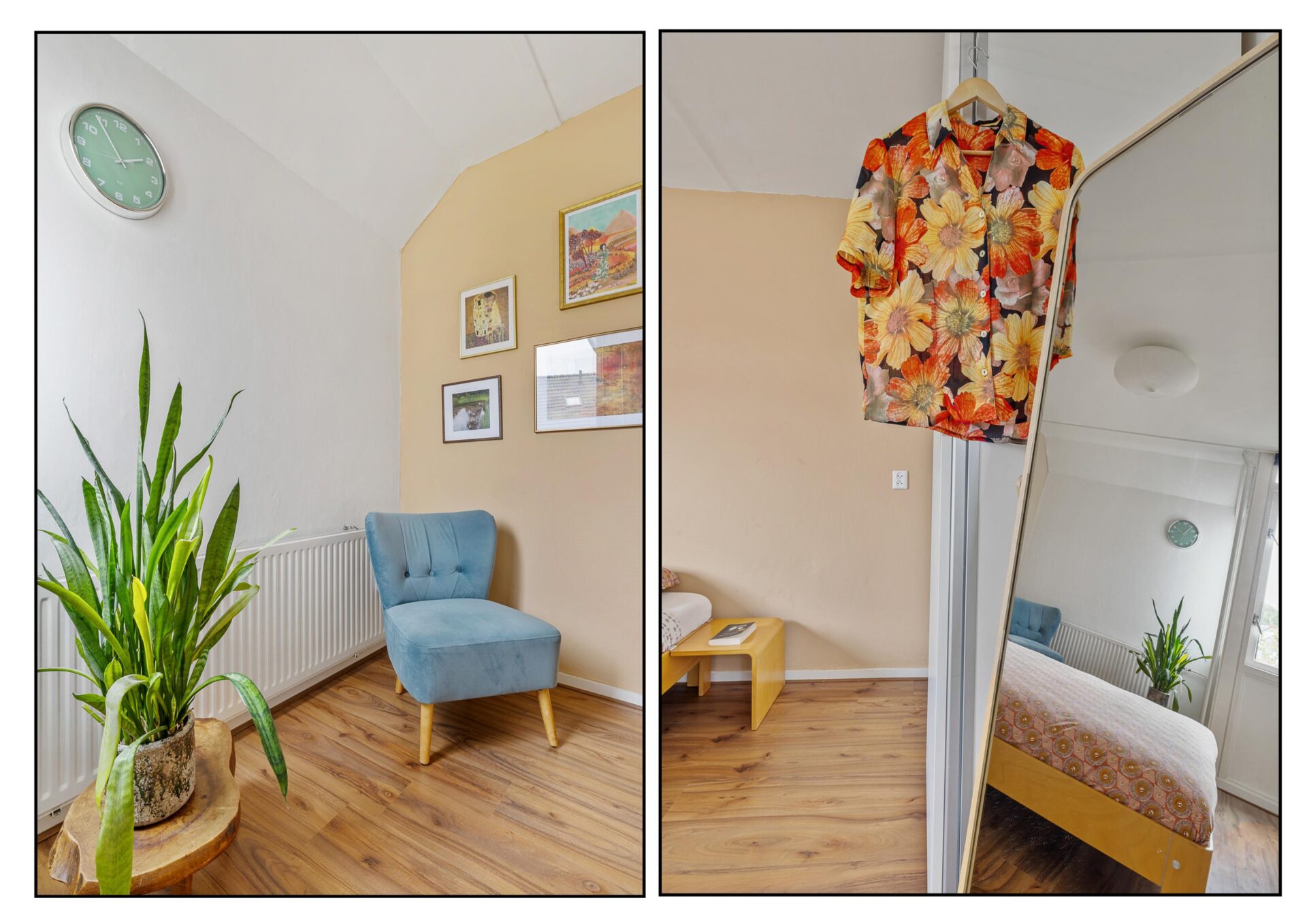 Overloop met afgesloten ruimte voor de wasmachine en droger, mooie lichte slaapkamer aan de voorzijde en ruime slaapkamer aan de achterzijde. Aan de achterzijde is een derde slaapkamer.