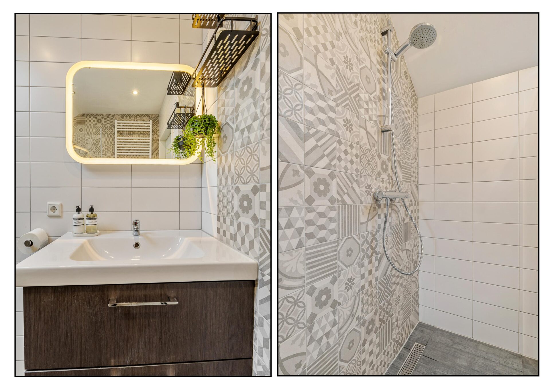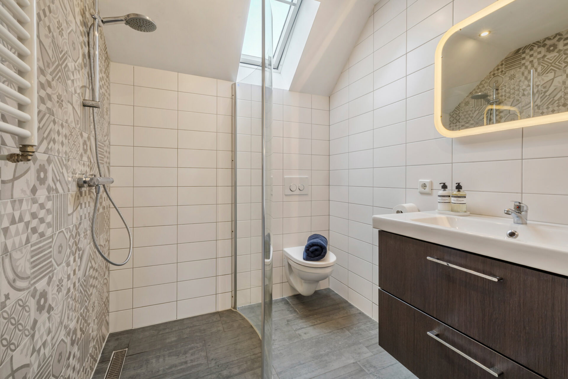 De moderne geheel betegelde badkamer is voorzien van een inloopdouche, hangcloset, wastafelmeubel en handdoekenradiator.