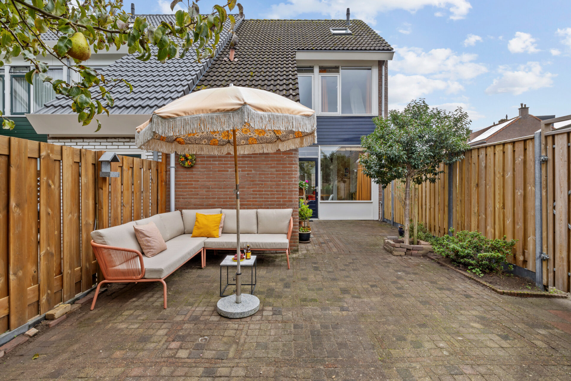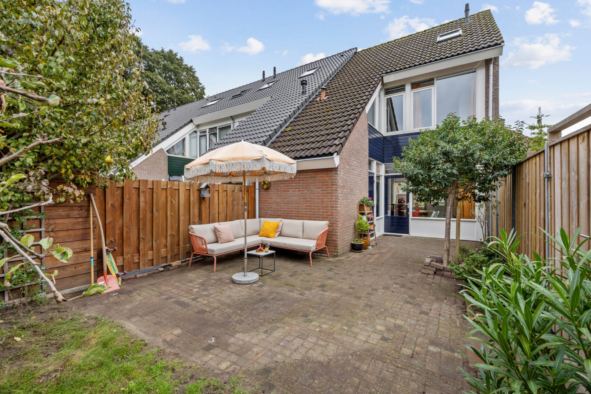 Toegang tot de ruime achtertuin met achterom op het noordwesten. ’s Zomers is het zonnig achterin de tuin en koel bij het huis. De sfeer is bijzonder en uitnodigend!