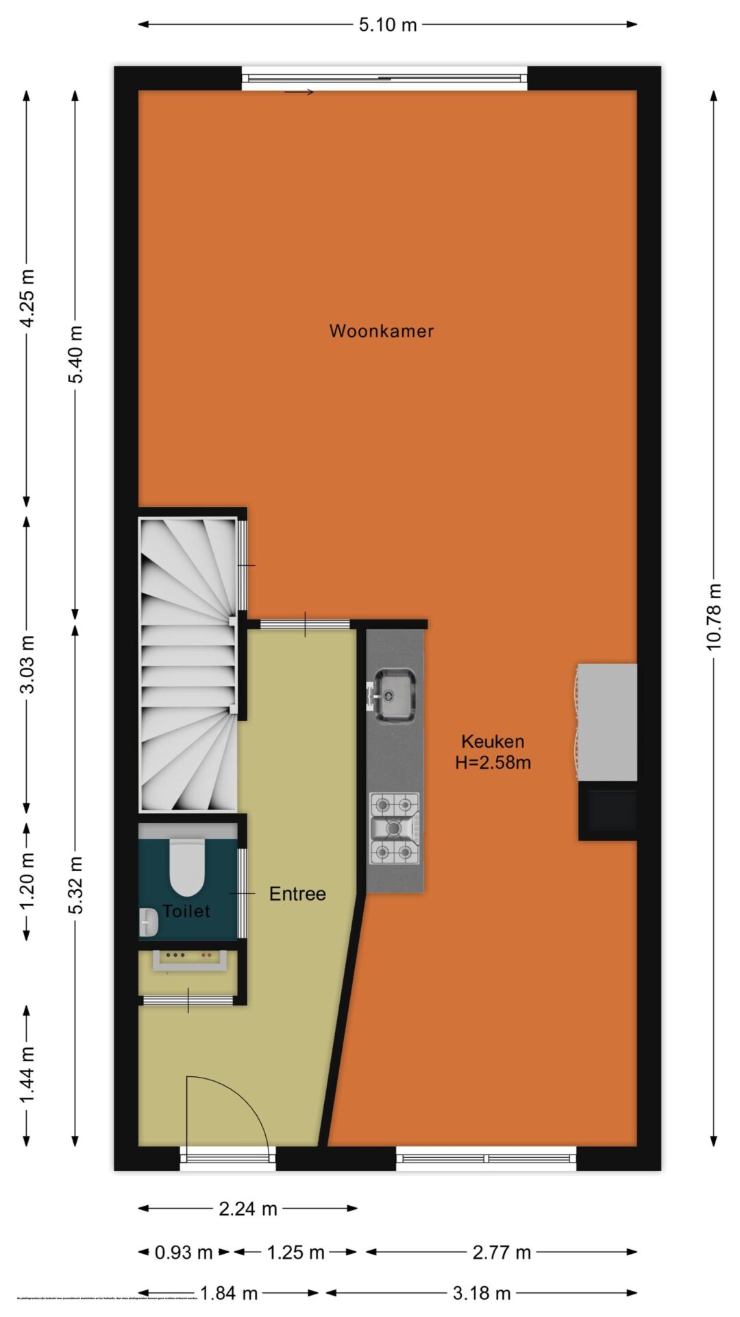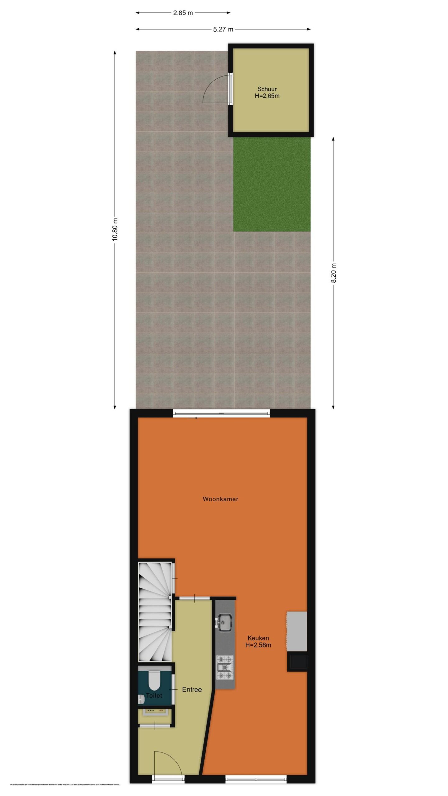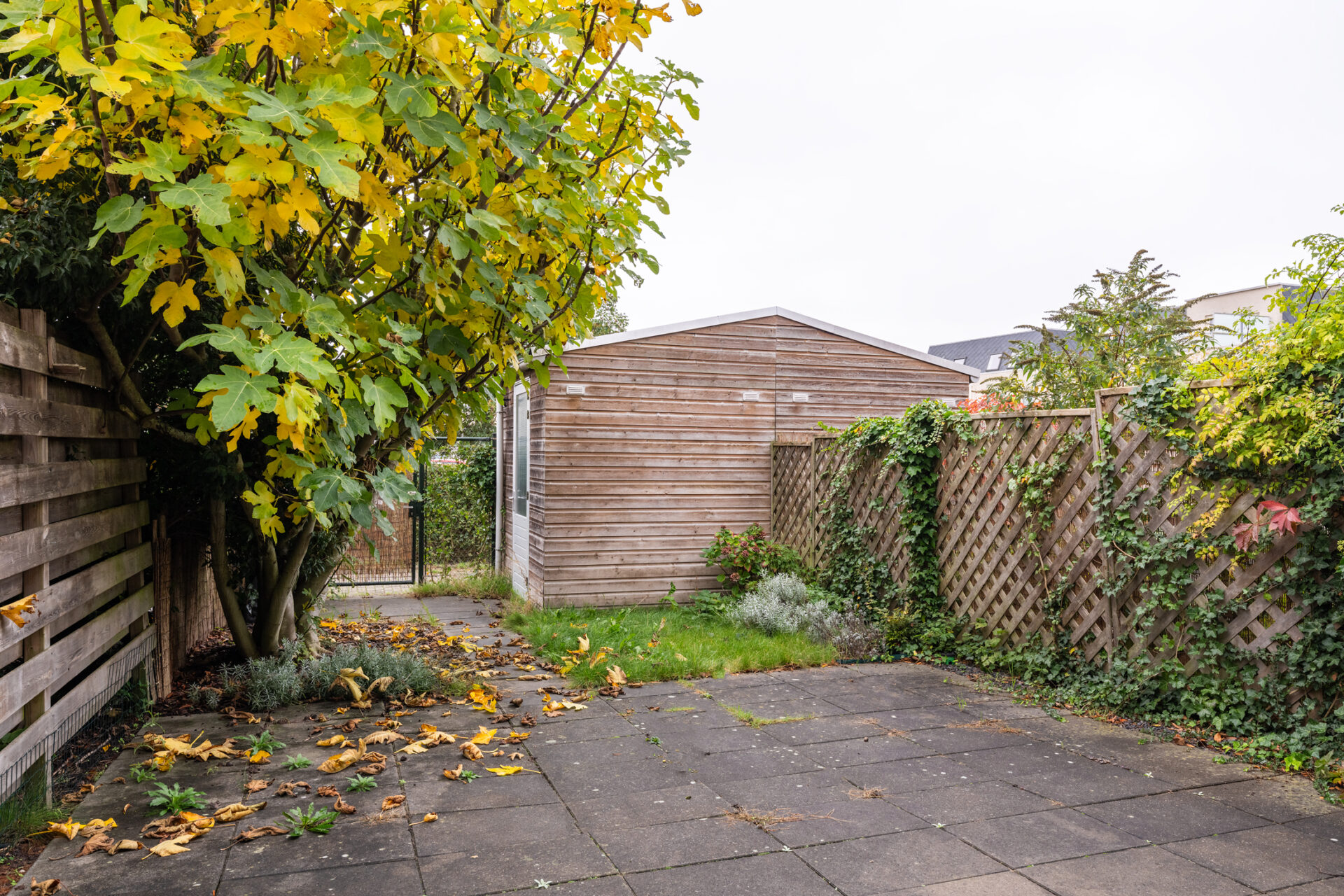 Entree, hal met meterkast, trapopgang, toilet met fontein, trapkast, woon-/eetkamer, open keuken voorzien van net keukenblok met inbouwapparatuur, deur naar de tuin. De achtertuin is gesitueerd op het oosten en voorzien van een houten berging en achterom.