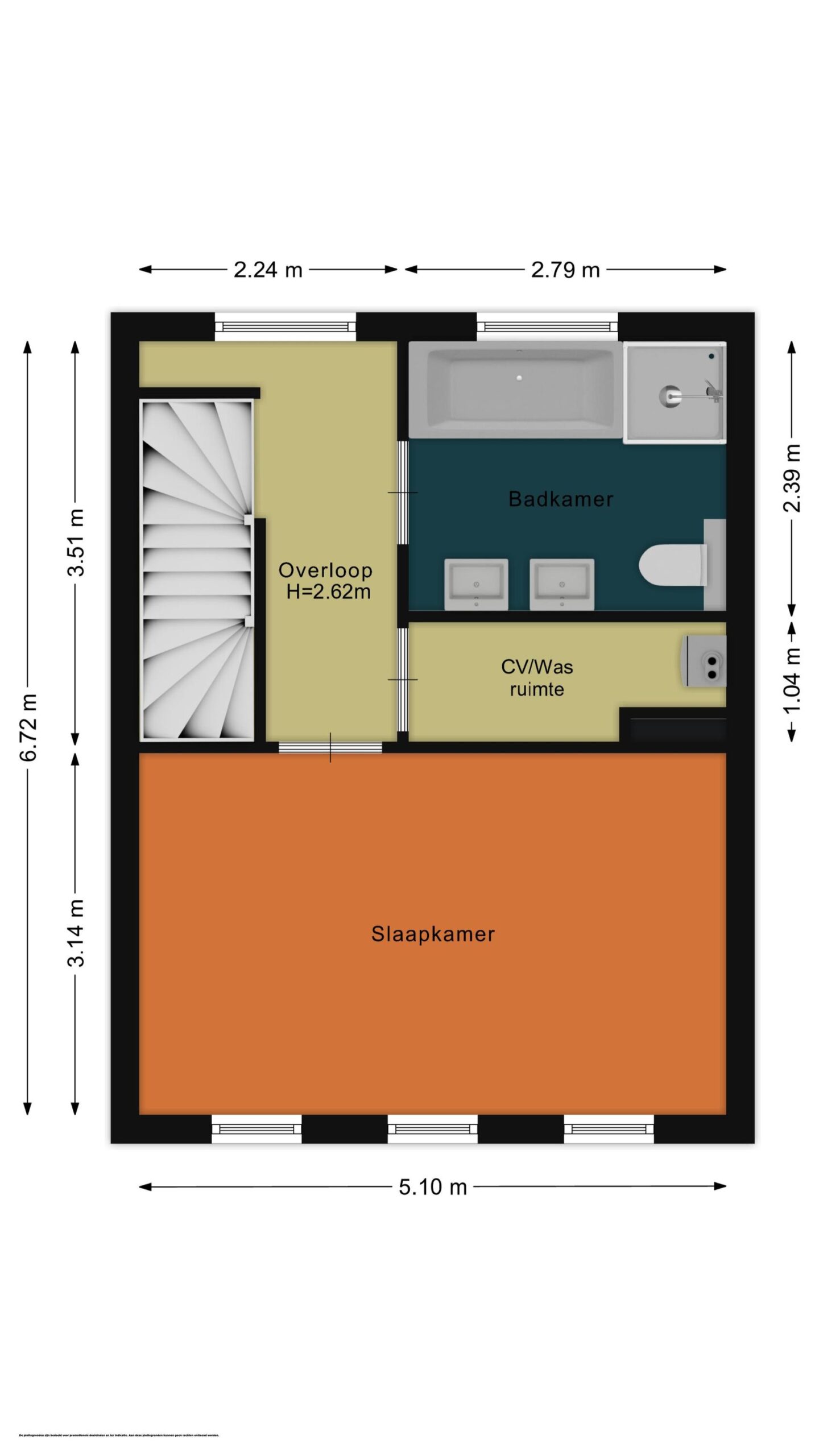 overloop, was-/cv-ruimte, 1 slaapkamer, badkamer v.v. ligbad, douche, toilet en dubbele wastafel.