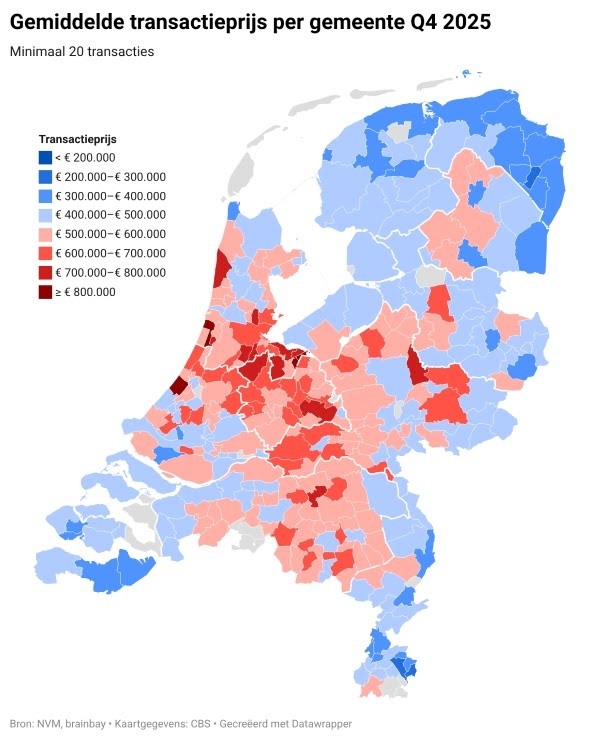 De gemiddelde verkoopprijs van een bestaande koopwoning is voor het eerst boven de 500.000 euro uitgekomen. Dat blijkt uit recente cijfers van de NVM. In het laatste kwartaal van 2025 betaalden kopers gemiddeld ruim 502.000 euro voor een woning. Ten opzichte van een jaar eerder is dat een stijging van bijna 4 procent.